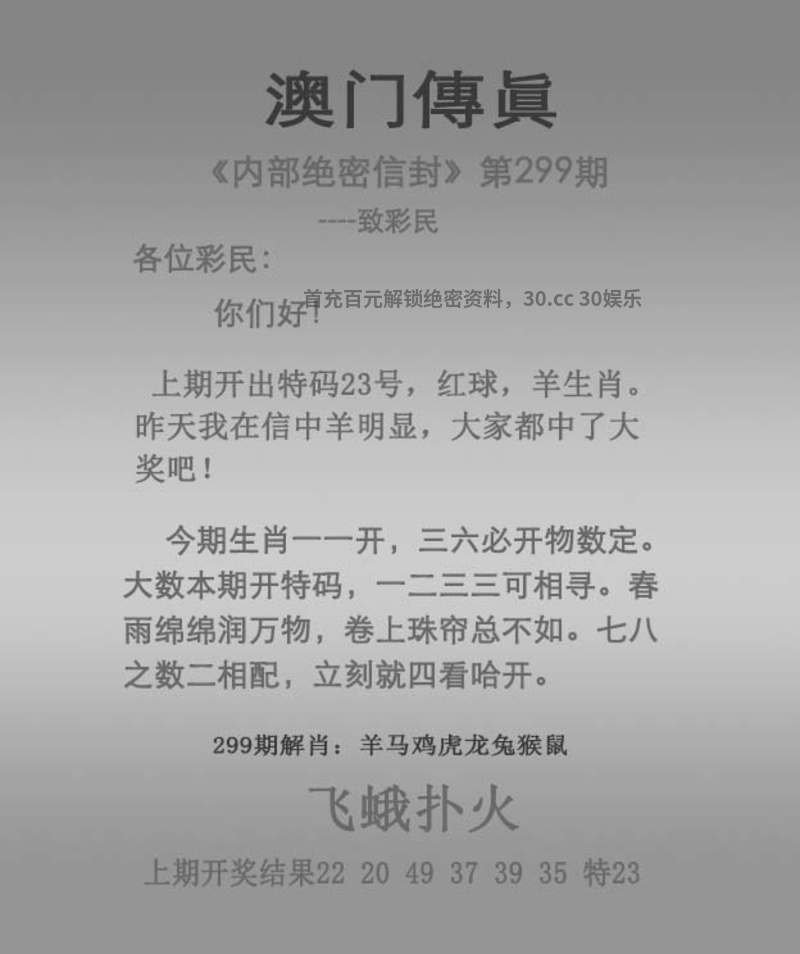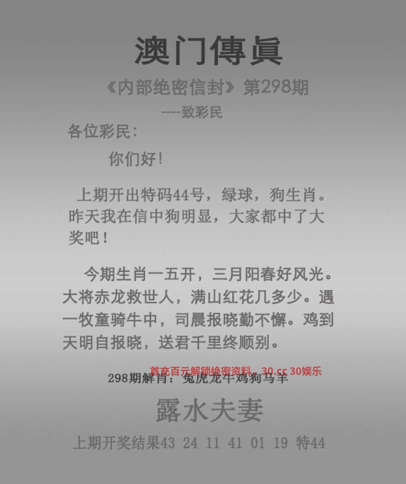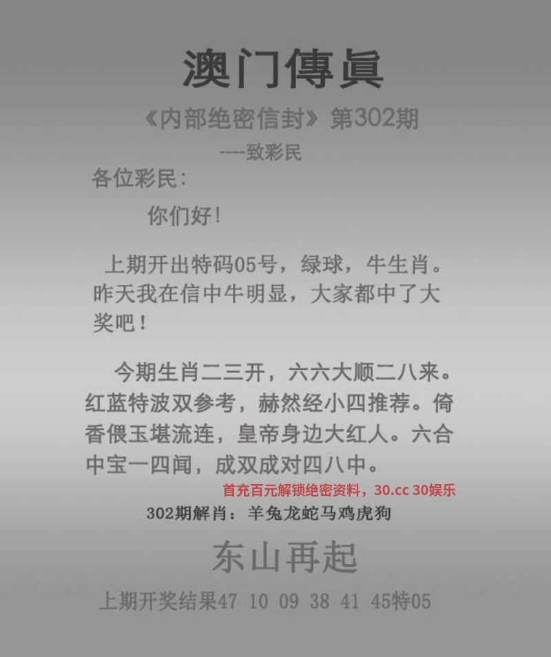 | 传真302期 今期生肖二三开,六六大顺二八来。 红蓝特波双参考,赫然经小四推荐。 倚香偎玉堪流连,皇帝身边大红人。 六合中宝一四闻,成双成对四八中。 东山再起 解:今期生肖二三开指23羊,六六大顺二八来指06鼠28虎,红蓝特波双参考指红波蓝波,成双成对四八中指双肖龙马猴虎鼠狗 综合:羊龙马猴兔鼠狗鸡猪 |
